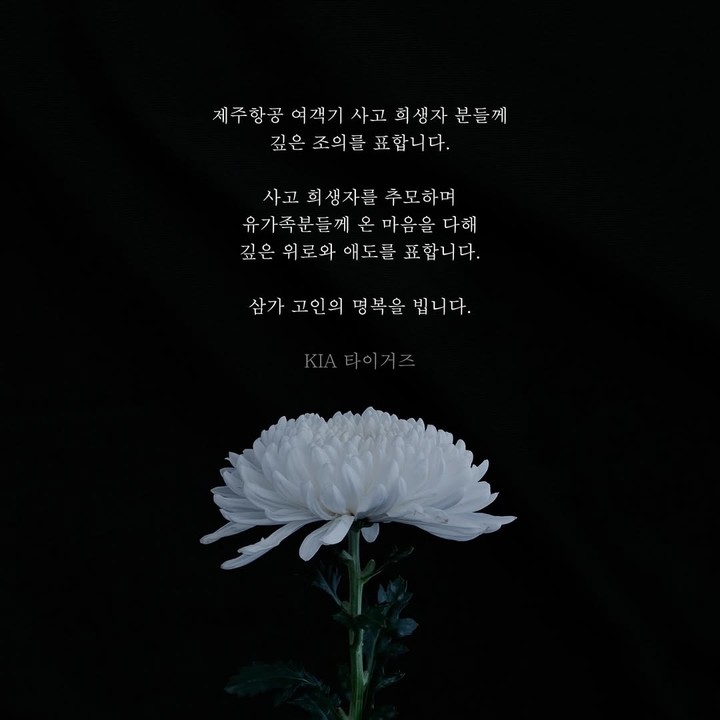 한편 KIA 타이거즈도 이번 참사의 희생자와 유가족들을 애도했다. 구단은 30일 공식 SNS를 통해 "제주항공 여객기 사고 희생자 분들께 깊은 조의를 표합니다. 사고 희생자를 추모하며, 유가족분들께 온 마음을 다해 위로와 애도를 표합니다. 삼가 고인의 명복을 빕니다"라는 글을 올렸다.