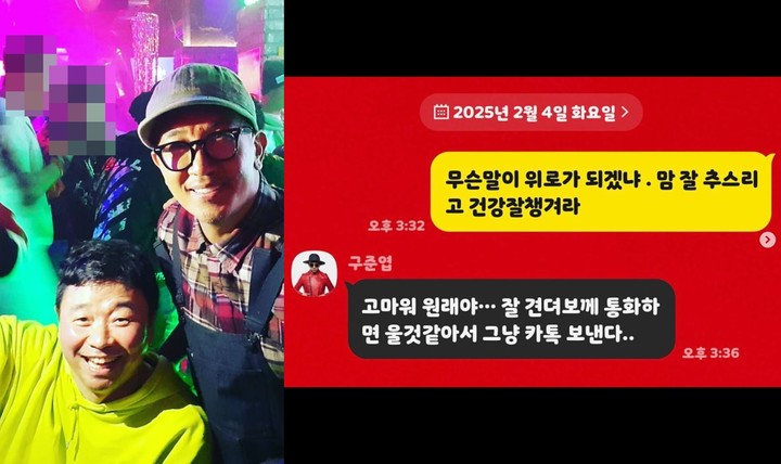 문자 속 강원래는 "무슨 말이 위로가 되겠냐. 마음 잘 추스리고 건강 잘챙겨라"며 위로했고 구준엽은 "고마워 원래야...잘 견뎌볼께 통화하면 울 것 같아서 그냥 카톡 보낸다"고 답했다.