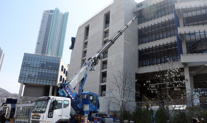 외부 안전 점검 업체 직원들은 고소 작업차(스카이 차)를 동원해 구조물 낙하 사고가 발생한 경기장 외벽 구조물 마잠 자재(루버)와 동일한 자재에 대해 점검했다.