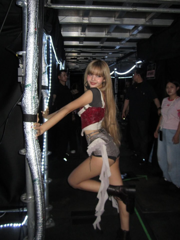 리사는 또 다른 의상으로, 핏한 레이스업 탑과 레더 쇼츠로 스타일링 했다. 무대 뒤에서 기쁨을 표출하는 모습과 포즈는 친근한 느낌을 선사한다.