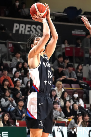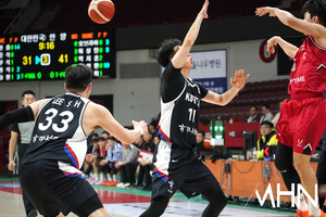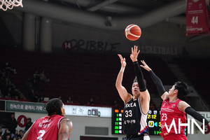 (MHN 안양, 박태성 기자) 25일 안양 정관장 아레나에서 2027 FIBA 농구 월드컵 아시아예선(W1) 대비 남자농구 국가대표팀 vs 안양 정관장 레드부스터스 연습경기가 열렸다.이원석이 경기를 펼치고 있다.