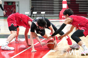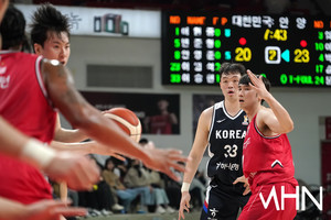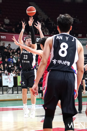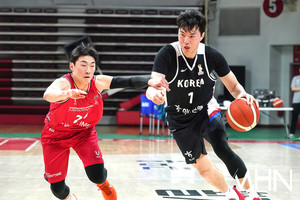 (MHN 안양, 박태성 기자) 25일 안양 정관장 아레나에서 2027 FIBA 농구 월드컵 아시아예선(W1) 대비 남자농구 국가대표팀 vs 안양 정관장 레드부스터스 연습경기가 열렸다.이현종이 경기를 펼치고 있다.