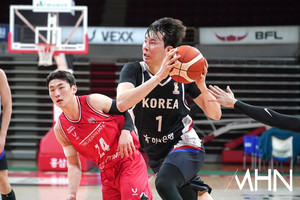 (MHN 안양, 박태성 기자) 25일 안양 정관장 아레나에서 2027 FIBA 농구 월드컵 아시아예선(W1) 대비 남자농구 국가대표팀 vs 안양 정관장 레드부스터스 연습경기가 열렸다.이현중이 경기를 펼치고 있다.