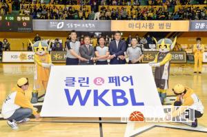 [윈터뉴스/더 바스켓=청주] 1일일 오후 청주실내체육관에서 청주 KB국민은행과 인천 신한은행과의 경기가 열렸다. 경기에 앞서 클린&페어 캠페인 기념 촬영을 하고 있다.