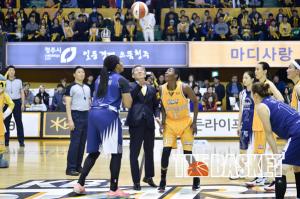 [윈터뉴스/더 바스켓=청주] 1일일 오후 청주실내체육관에서 청주 KB국민은행과 인천 신한은행과의 경기가 열렸다. KB 윤종규 구단주가 홈 개막전에서 시구를 하고 있다.