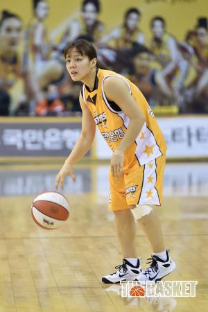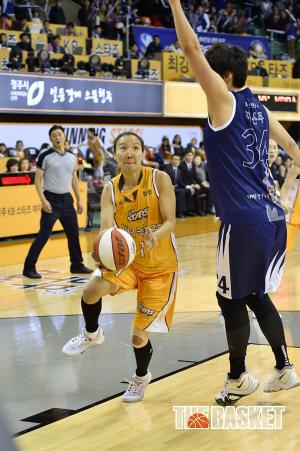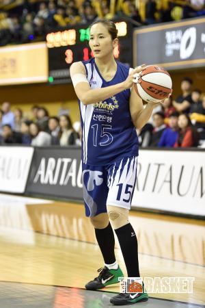 [윈터뉴스/더 바스켓=청주] 1일 오후 청주실내체육관에서 청주 KB국민은행과 인천 신한은행과의 경기가 열렸다. 신한 신정자가 패스할 곳을 찾고 있다.