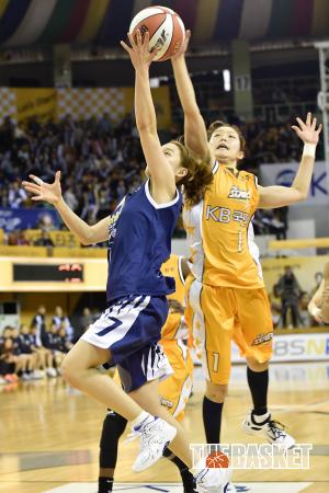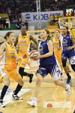 [윈터뉴스/더 바스켓=청주] 1일 오후 청주실내체육관에서 청주 KB국민은행과 인천 신한은행과의 경기가 열렸다. KB 김보미가 신한 장신센터 하은주의 수비를 피해 밑으로 공격을 시도하고 있다.