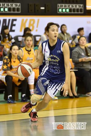 [윈터뉴스/더 바스켓=청주] 1일 오후 청주실내체육관에서 청주 KB국민은행과 인천 신한은행과의 경기가 열렸다. 신한 윤미지가 돌파를 하고 있다.