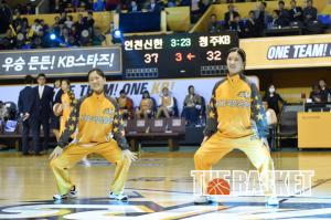 [윈터뉴스/더 바스켓=청주] 1일 오후 청주실내체육관에서 청주 KB국민은행과 인천 신한은행과의 경기가 열렸다. 이번 드래프트를 통해 입단한 KB 박진희, 김현아 선수가 홈팬들 앞에서 댄스로 신고식을 하고 있다.
