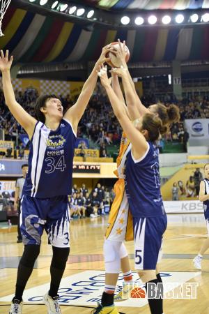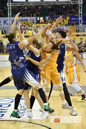 [윈터뉴스/더 바스켓=청주] 1일 오후 청주실내체육관에서 청주 KB국민은행과 인천 신한은행과의 경기가 열렸다. 양팀 선수들이 리바운드를 잡기 위해 몸싸움을 벌이고 있다.