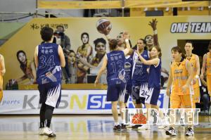 [윈터뉴스/더 바스켓=청주] 1일 오후 청주실내체육관에서 청주 KB국민은행과 인천 신한은행과의 경기가 열렸다. KB 햄비가 골밑슛을 하고 있다.
