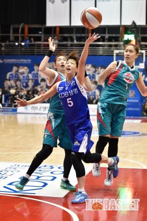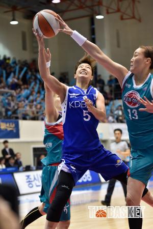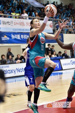 [윈터뉴스/더 바스켓=구리] 31일 오후 구리실내체육관에서 구리 KDB와 부천 KEB의 개막 경기가 열렸다. KEB 김정은이 골밑슛을 하고 있다.