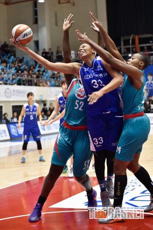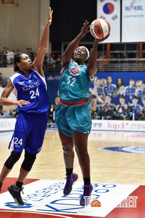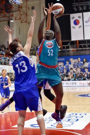 [윈터뉴스/더 바스켓=구리] 31일 오후 구리실내체육관에서 구리 KDB와 부천 KEB의 개막 경기가 열렸다. KEB 귀화선수 첼시리가 골밑슛을 하고 있다.