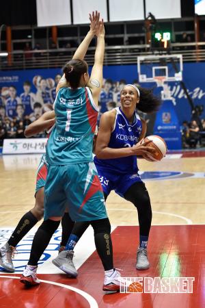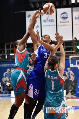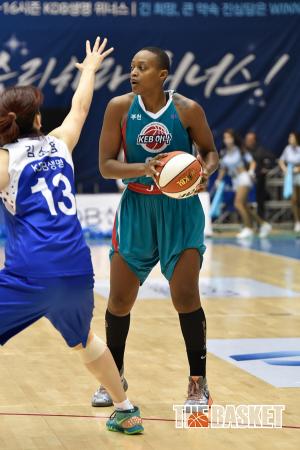 [윈터뉴스/더 바스켓=구리] 31일 오후 구리실내체육관에서 구리 KDB와 부천 KEB의 개막 경기가 열렸다. 귀화 선수로 KEB에 입단한 첼시리가 용병 못지않은 체구로 골밑에서 상대 수비를 괴롭히고 있다.