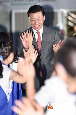 [윈터뉴스/더 바스켓=구리] 31일 오후 구리실내체육관에서 구리 KDB와 부천 KEB의 개막 경기가 열렸다. 홈팀 KDB 김영주 감독이 유소년 농구단의 환호를 받으며 경기장에 입장하고 있다.