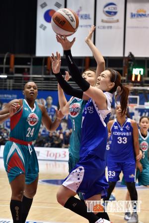 [윈터뉴스/더 바스켓=구리] 31일 오후 구리실내체육관에서 구리 KDB와 부천 KEB의 개막 경기가 열렸다. KDB 한채진이 속공 레이업슛을 하고 있다.