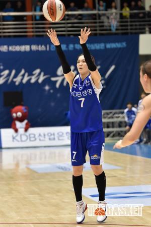 [윈터뉴스/더 바스켓=구리] 31일 오후 구리실내체육관에서 구리 KDB와 부천 KEB의 개막 경기가 열렸다. KDB 한채진이 3점슛을 시도하고 있다.