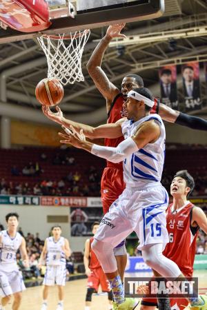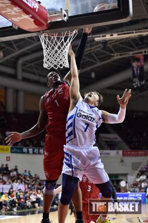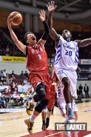 [윈터뉴스/더 바스켓=안양] 24일 오후 안양실내체육관에서 안양 KGC와 서울 삼성의 경기가 열렸다. KGC 이정현이 삼성 라틀리프의 수비를 피해 레이업 슛을 하고 있다.