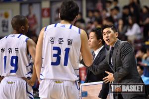 [윈터뉴스/더 바스켓=안양] 24일 오후 안양실내체육관에서 안양 KGC와 서울 삼성의 경기가 열렸다. 삼성 이상민 감독은 라틀리프가 벤치로 물러난 상황에서 김준일에게 골밑 수비에 대해 설명하고 있다.
