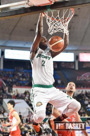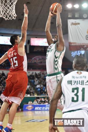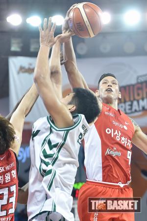 [더 바스켓=서울] 25일 오후 잠실학생체육관에서 서울 SK와 원주 동부의 경기가 열렸다. 동부 벤슨은 사이먼이 부상으로 빠진 SK를 상대로 골밑에서 맹활약하고 있다.