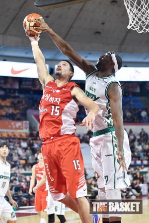 [윈터뉴스/더 바스켓=안양] 24일 오후 안양실내체육관에서 안양 KGC와 서울 삼성의 경기가 열렸다. KGC 로드가 삼성 박재현의 골밑슛을 블록슛하고 있다.