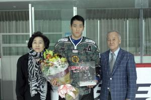 17일 인천 선학국제빙상장에서 열린 아시아리그 아이스하키 2015-2016 대명 상무와 일본제지 크레인즈의 경기 시작 전에 200포인트를 기록한 김상욱(27, F)에게 부모님이 직접 꽃다발과 모형 피규어를 전달했다.이날 부모님이 직접 시상식을 한 것에 대해 이현준 대명 매니저는 "선수에게 이런 기록이 나오게 된 것은 부모님의 뒷바라지가 있었기 때문이다. 이에 부모님이 직접 전달해 더욱 의미있는 시상식을 만들고 싶었다"고 취지를 밝혔다.