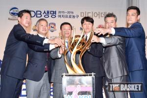 [윈터뉴스/더 바스켓=서울] 19일 오전 청담 리베라호텔에서 WKBL 미디어데이가 열렸다. 6개구단 감독들이 모여 트로피와 함께 포즈를 취하고 있다.