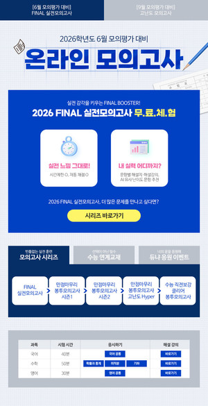 (MHN 장지원 인턴기자) EBS가 2026학년도 6월 모의평가를 위한 '온라인 모의고사 서비스'를 제공한다.12일부터 수험생의 실전 감각 강화를 위해 온라인 모의고사 서비스가 EBSi에 무료 제공된다.온라인 모의고사는 ‘2026 FINAL 실전모의고사’ 시리즈에서 선제된 100% 신규 문항으로 구성되었으며, 실제 수능과 동일한 난도와 체제를 반영해 국어(40분), 수학(50분), 영어(30분)으로 운영된다. 특히, 시간 제한과 자동 채점 기능을 통해 실제 수능처럼 훈련할 수 있으며, 전 문항 해설강의와 AI 기반 유사난이도 문항