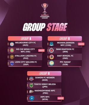 (MHN 금윤호 기자) 여자축구 아시아 무대에서 '남북 대결'이 펼쳐진다.아시아축구연맹(AFC)은 지난 11일 말레이시아 쿠알라룸푸르의 AFC 하우스에서 2025-2026 여자 챔피언스리그(AWCL) 본선 조 추첨식을 개최했다.조 추첨 결과 지난해 여자축구 WK리그 챔피언 수원FC위민은 북한의 내고향여자축구단과 도쿄 베르디 벨레자(일본), ISPE WFC(미얀마)와 함께 C조에 배정됐다.두 번째 시즌을 맞이한 이번 대회 조별리그에는 2024-2025 AFC 여자 클럽대항전 랭킹 상위 6개국(호주, 한국, 일본, 중국, 베트남, 아랍