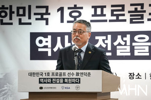 (MHN 박태성 기자) 12일 서울 중구 프레스센터 서울클럽홀에서 ‘대한민국 1호 프로골프 선수 故 연덕춘(1916~2004) 역사와 전설을 복원하다’ 기념 관련 기자회견을 가졌다.이날 KPGA 김원섭 회장, 강형모 대한골프협회 회장, 일본골프협회 야마나카 히로시 최고 운영 책임자가 참석했다.야마나카 히로시 최고 운영 책임자가 축사를 하고 있다.