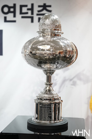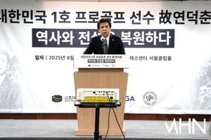 (MHN 박태성 기자) 12일 서울 중구 프레스센터 서울클럽홀에서 ‘대한민국 1호 프로골프 선수 故 연덕춘(1916~2004) 역사와 전설을 복원하다’ 기념 관련 기자회견을 가졌다.이날 KPGA 김원섭 회장, 강형모 대한골프협회 회장, 일본골프협회 야마나카 히로시 최고 운영 책임자가 참석했다.고 연덕춘 우승 트로피에 한국 이름이 새겨져 있다.