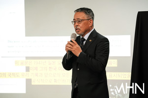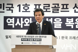 (MHN 박태성 기자) 12일 서울 중구 프레스센터 서울클럽홀에서 ‘대한민국 1호 프로골프 선수 故 연덕춘(1916~2004) 역사와 전설을 복원하다’ 기념 관련 기자회견을 가졌다.이날 KPGA 김원섭 회장, 강형모 대한골프협회 회장, 일본골프협회 야마나카 히로시 최고 운영 책임자가 참석했다.김원섭 회장이 기자들의 질문에 답변을 하고 있다.