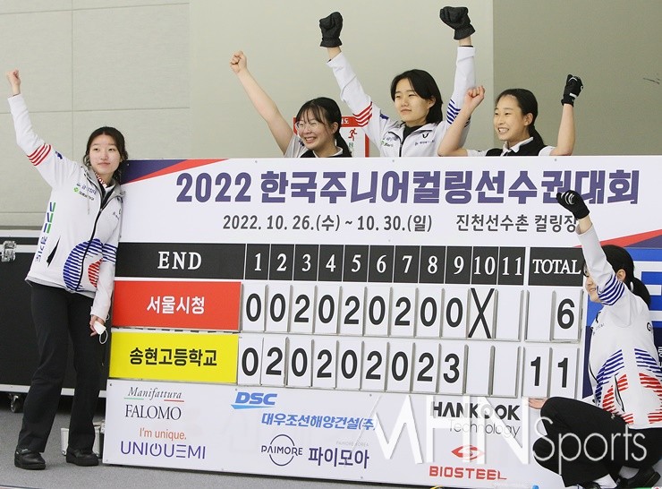 - 2 [Ms포토]송현고 ‘기쁨의 우승 세리모니!’ (MHN스포츠 진천, 권혁재 기자) 충북 진천선수촌에서 열린 ‘2022 한국주니어컬링선수권대회’에서 경일대학교(남자부)와 송현고등학교(여자부)가 우승을 차지하며 남녀 컬링 주니어 국가대표로 선발됐다.경일대(스킵 김은빈)는 남자부 결승에서 중학생팀으로 파란을 일으키며 결승에 오른 의정부시G-스포츠클럽(스킵 김연재)을 8:2로 누르고 2년 연속 우승 트로피를 들어올렸다.여자부 송현고(스킵 강보배)는 준결승에서 의성여고(스킵 오지현)을 격파한데 이어 결승에서 최근 창단한 서울시청(스킵 박유빈)과 팽팽한 승부를 펼치며 11:6으로 승리하고