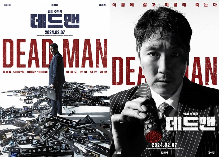 조진웅, 김희애, 이수경 출연의 영화 ‘데드맨’이 2월 7일 개봉을 확정 짓고 1차 포스터 2종을 공개하며 24년 설 연휴 출격을 예고했다. ‘데드맨’은 이름값으로 돈을 버는 일명 바지사장이 1천억 횡령 누명을 쓰고 ‘죽은 사람’으로 살아가게 된 후 빼앗긴 인생을 되찾기 위해 추적에 나서는 이야기다.