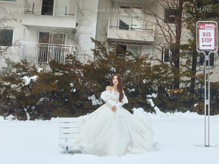 공개된 사진 속 솔라는 새하얀 드레스를 입고 눈 내린 버스 정류장 벤치에 앉아 있다. 이질감에서 오는 묘한 조화가 눈길을 끄는 가운데, 쓸쓸하면서도 서늘한 겨울의 정취가 돋보인다. 특히, 누군가를 기다리는 듯한 다양한 감정선이 투영된 솔라의 눈빛이 인상적이다.