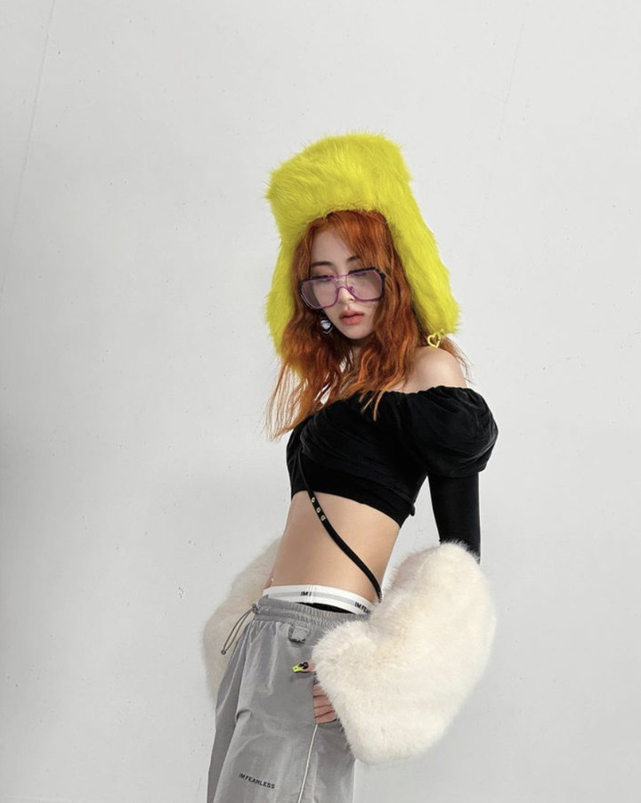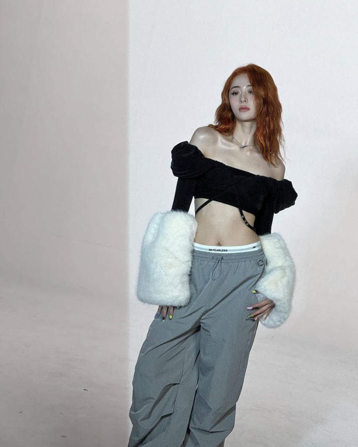 사진 속 허윤진은 검은색 오프숄더 크롭톱 상의와 나일론 스트링 파라슈트 팬츠를 착용해 힙한 패션 스타일을 선보였다. 여기에 'I’M FEARLESS'라는 르세라핌 특유의 슬로건이 적힌 이너웨어 허리밴드를 드러내 섹시함을 추가했다. 마지막으로 퍼 재질의암 워머와 트루퍼햇으로 포인트를 줘 유니크한 매력을 완성했다.