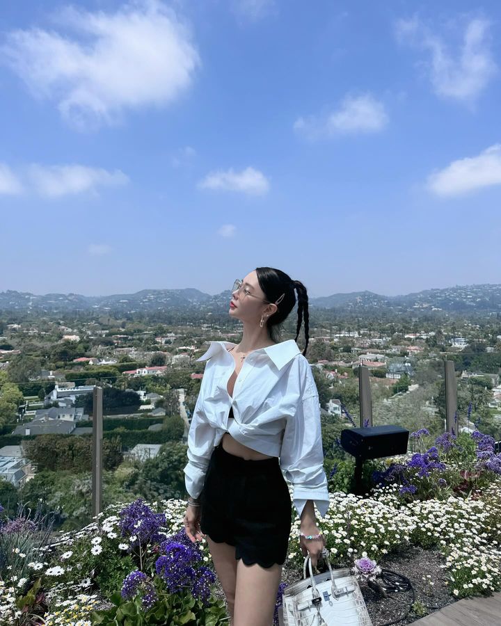 미국의 한 루프탑 건물에서 촬영된 해당 사진에는 크롭 셔츠 스타일링을 선보인 클라라의 모습이 담겼다.