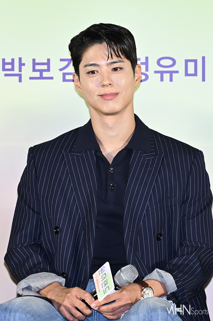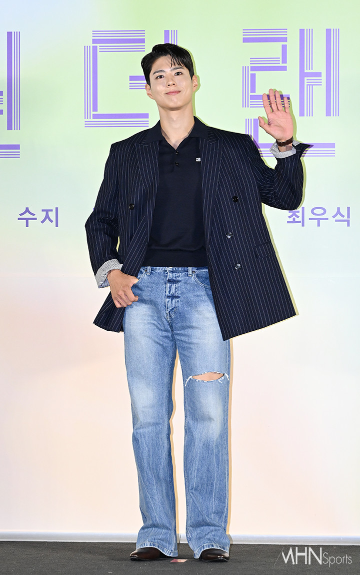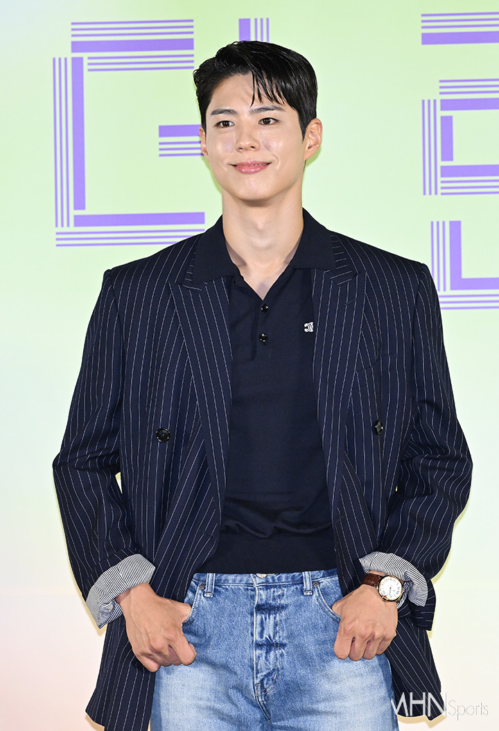 박보검은 청바지, 네이비 폴로 셔츠에 같은 톤의 스트라이프 재킷을 매치한 댄디한 룩을 완성시켰다. 특히 캐주얼룩에도 우월한 비율의 피지컬에 조각같은 비주얼로 시선을 사로잡았다.