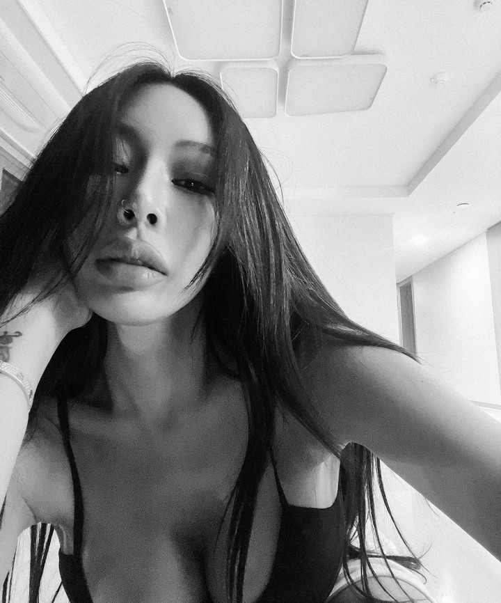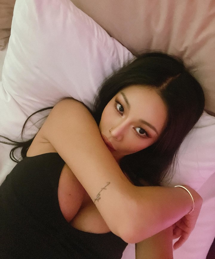 공개된 사진 속 제시는 검은색 끈 나시를 입고 누워서 셀카를 촬영하고 있다.
