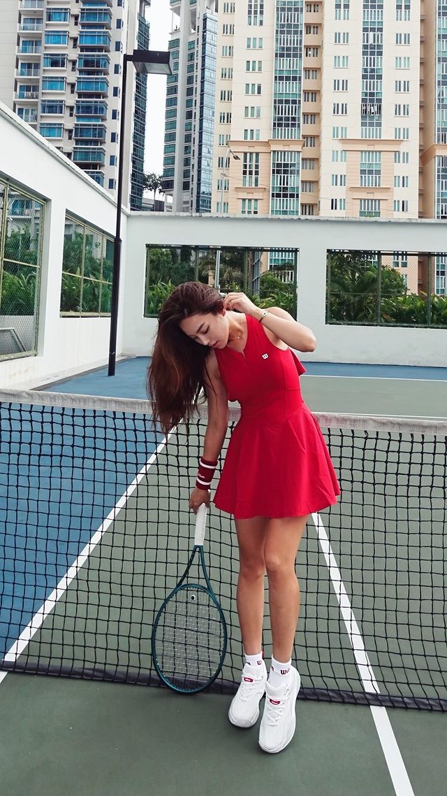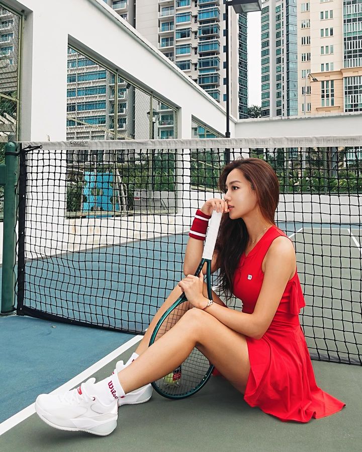 공개된 사진 속 김희정은 빨간색 원피스와 테니스 라켓으로 테니스 룩을 연출하면서도 관리로 다져진 구릿빛 몸매를 드러냈다.