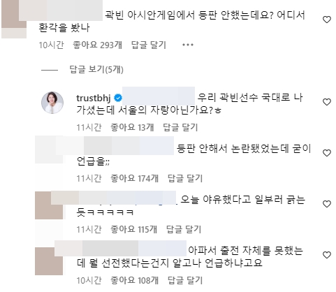한 팬이 "곽빈은 아시안게임에서 등판하지 않았다. 어디서 환각을 봤느냐"고 지적하자 배 의원은 해당 댓글에 답글로 "우리 곽빈선수 국대로 나갔는데 서울의 자랑 아니냐ㅎ"고 답했다.