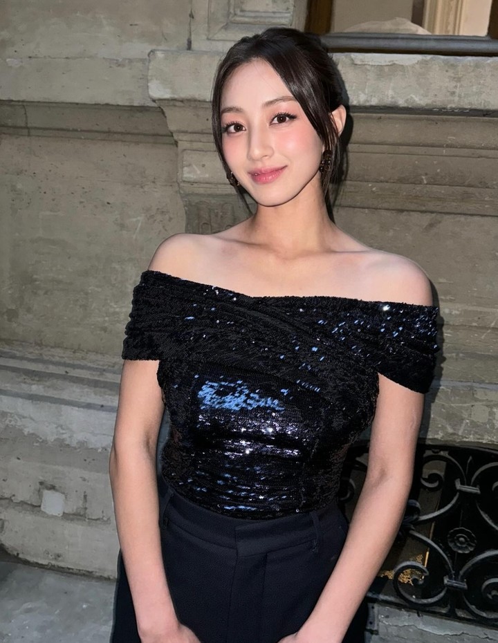 SNS를 통해 공개된 다수 사진 속 지효는 얼굴 옆으로 가볍게 뺀 앞머리와 더불어 단정하게 올려묶은 번헤어로 스타일을 연출했다. 여기에 아름다운 쇄골과 어깨라인, 등을 고스란히 드러낸 블랙 오프숄더 탑, 이와 대비되는 단정한 블랙 슬랙스로 코디를 연출했다.