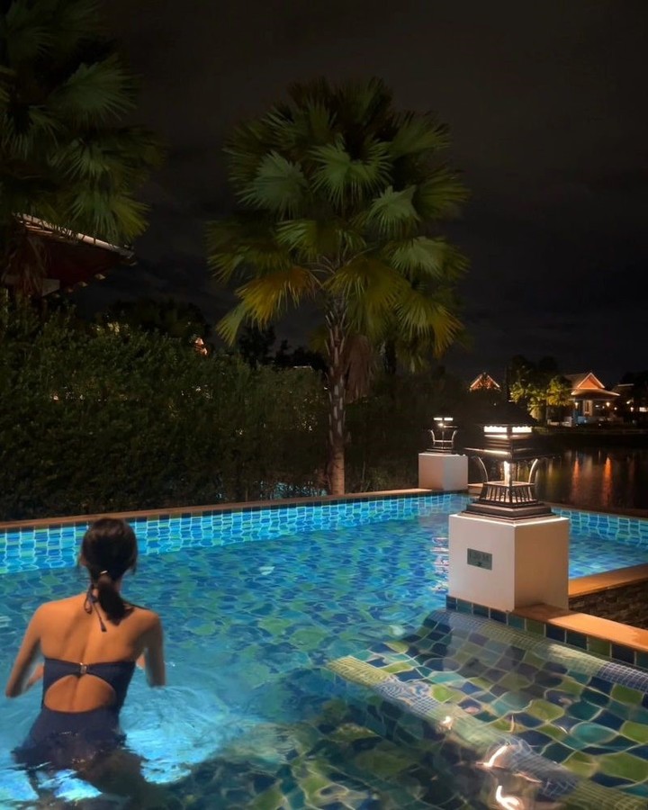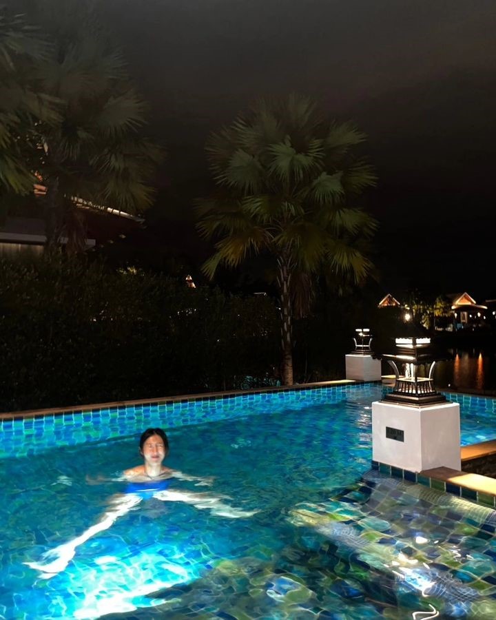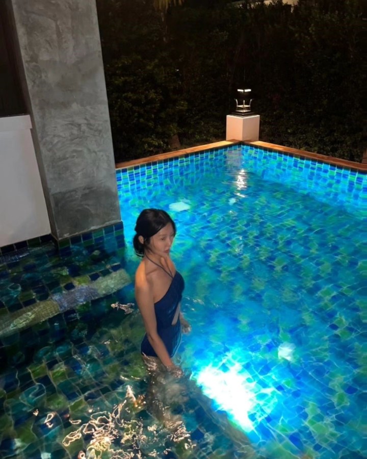 공개된 사진 속 주현영은 수영장에서 푸른색 수영복을 입고 여가를 만끽하고 있다.