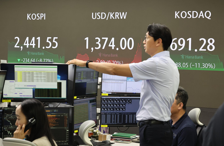 코스피 지수는 이날 전장 대비 234.64포인트(8.77%) 하락한 2,441.55에 거래를 마쳤다.