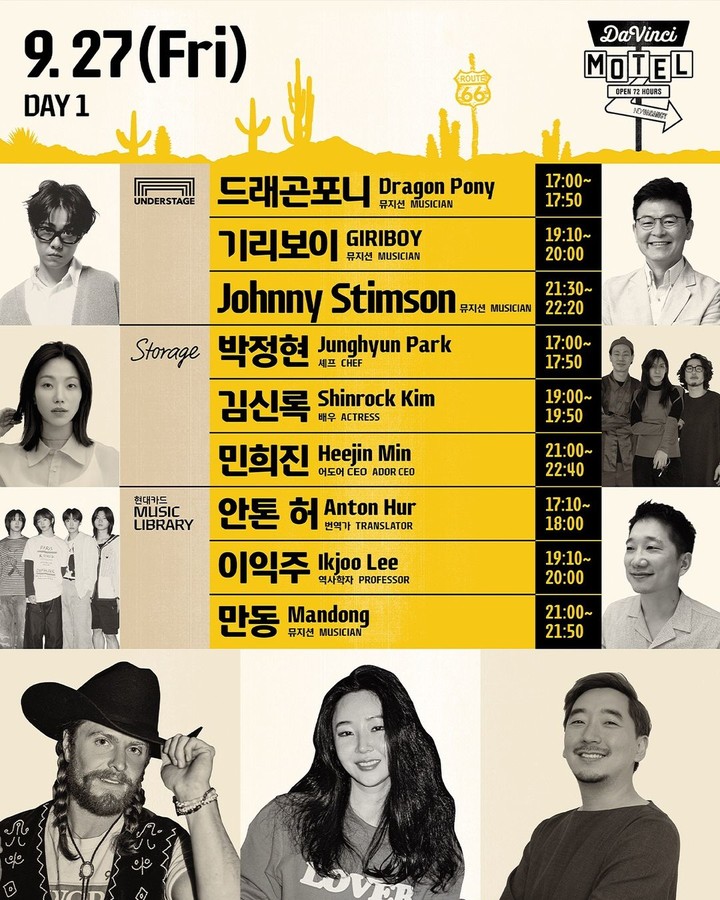 '다빈치모텔'은 오는 9월 27~29일 이태원 현대카드 구역 일대(바이닐앤플라스틱, 언더스테이지, 뮤직 라이브러리, 스토리지, 아트 라이브러리)에서 개최되는 행사로, 사흘 동안 아카데믹부터 엔터테인먼트까지 각 분야를 대표하는 아이콘들이 토크와 공연을 선보인다.