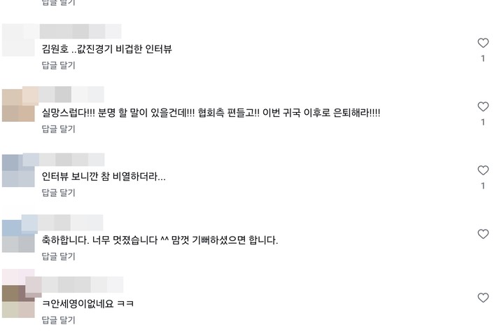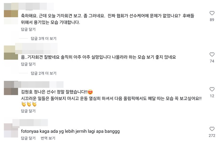 한 팬은 "안세영 선수가 무엇을 이야기했는지 파악을 못했냐"며 "실망스러운 인터뷰 잘 봤다. 정말 안세영의 철저히 외로운 혼자만의 싸움이 될 것이다"라며 김원호를 질책했다. 또 다른 팬도 "기자회견을 잘 봤고, 아주 실망했다"며 "나몰라라 하는 모습 보기 좋지 않다"고 냉랭한 댓글을 남겼다.