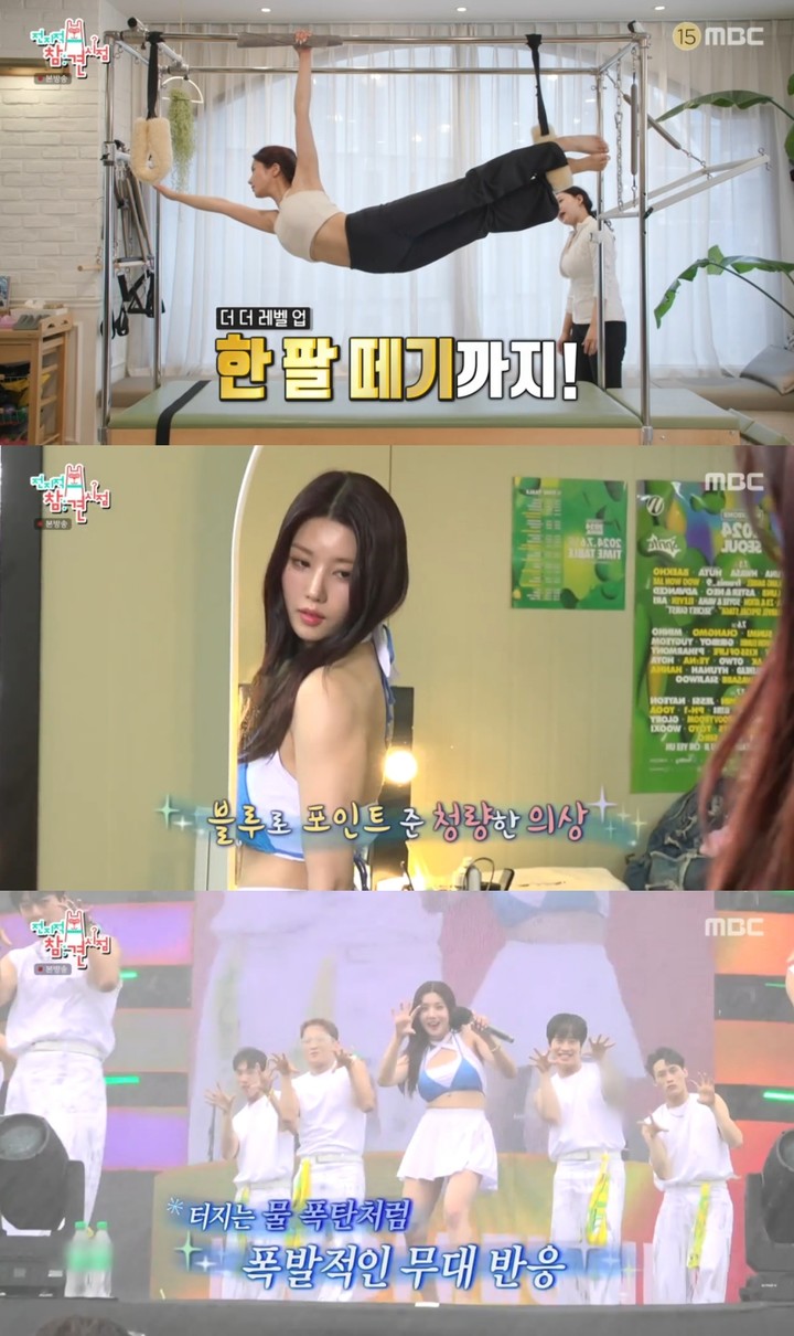먼저 이날 방송에는 '워터밤' 공연 당일 필라테스 숍을 찾은 권은비의 모습이 그려졌다. 공연 6시간 전 운동에 매진하는 모습에 놀라는 MC들에게 "당일에 펌핑을 해야 잔근육이 보인다"라며 프로페셔널한 모습을 보였다.