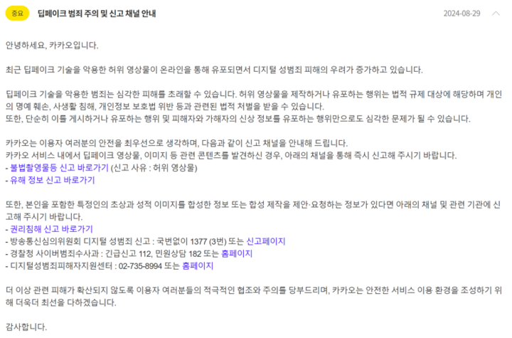 카카오는 고객센터와 카카오톡 공지사항을 통해 "카카오 서비스 내에서 딥페이크 영상물, 이미지 등 관련 콘텐츠를 발견한 경우 즉시 신고해달라"며, '딥페이크 범죄 주의 및 신고 채널 안내'를 29일 공지했다.