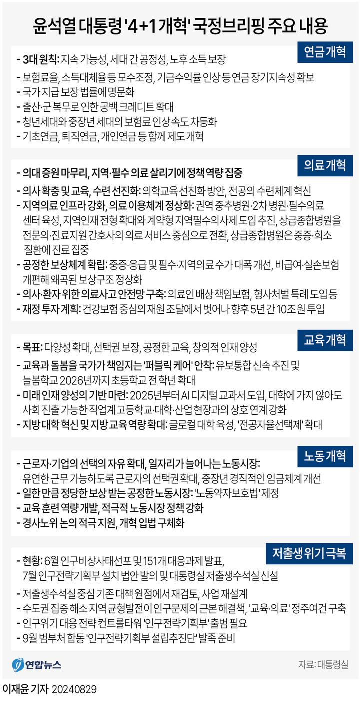 (MHN스포츠 주진노) 윤석열 대통령은 29일 국정브리핑에서 연금·의료·교육·노동 등 4대 개혁과 저출생 대응을 포함한 '4+1 개혁'을 완수하겠다는 강한 의지를 밝혔다. 윤 대통령은 이 개혁을 "소명"으로 규정하며, "쉬운 길을 가지 않겠다"며 국민에게 맡겨진 소명을 반드시 완수하겠다고 강조했다.