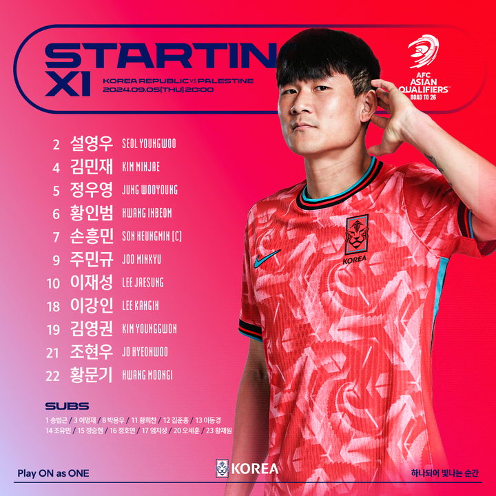 FIFA 랭킹 23위 한국은 김민재를 비롯해 손흥민(토트넘)과 이강인(파리 생제르맹), 황인범(페예노르트), 이재성(마인츠) 등 유럽에서 뛰는 주축 선수들이 대거 선발 출전하면서 96위 팔레스타인을 상대로 안방에서 완승 거둘 것으로 예상됐다.